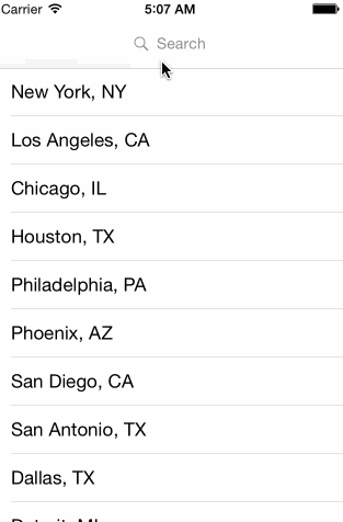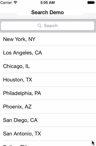 }Here's what this looks like when running. Notice that unlike in the search display controller example, we are using the same table view to display the search results instead of overlaying of a separate table view. However, unlike when working with just the search bar, we still have the built in animation when transitioning to the search interface.