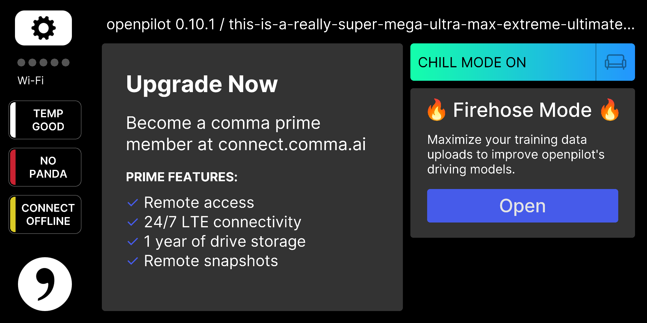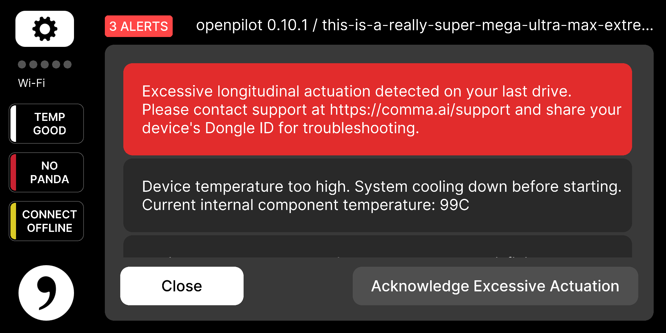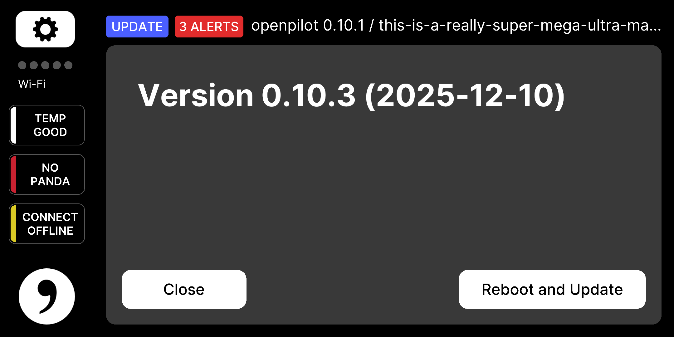 …mmaai#1583) * comma four: fix missing WiFi show_event (commaai#36858) * can't do this * can do this * comma four: rm duplicate wifi show_event * comma four: fix WiFi panel not starting at the top (commaai#36859) * fix * fix * NavWidget: disable nav bar for vertical scrollers (commaai#36857) * disable nav bar vert scroller * cmt * ui: improve network sort (commaai#36855) * better sort * clean up * comma four: reset WiFi SSID scroll on show (commaai#36861) reset scroll * WifiUi: fix infinite wraps (commaai#36863) * fix infinite wrap * fix selection * Revert "fix selection" This reverts commit 555c579. * revert * revert * revert * revert * cleaner * cleaner * mypy!! * WifiUi: remove delayed network panel open (commaai#36865) not used * comma four: fix WiFi scroll to (commaai#36864) * fix selection * stash * Revert "stash" This reverts commit d04ed66. * clean up * clean up * move * fix * WifiUi: pause updates while user is scrolling (commaai#36866) * pause updates while user is scrolling * clean up * WifiUi: pause updates while user is interacting (commaai#36868) int not scroll * Widget: implement layout function (commaai#36869) * we can implement layout to fix flashing * reorder * fix faster than normal snap and reduce duplicate calculations * yes * comma four: follow current network (commaai#36862) * stay * whoops * whoops * fix * fix div by z * we can implement layout to fix flashing * Revert "we can implement layout to fix flashing" This reverts commit 7278a1e. * random * clean up * wtf * rev * smooth * we can implement layout to fix flashing * snap looks so much better * fix * rev * better name * cmt * less random * even less random * simpler * cmt * clean up * clean up * clean up * GuiScrollPanel2: fix possible crash (commaai#36870) fix crash * WifiUi: tweak unselected button size (commaai#36871) looks too spaces * rm dead unlog_ci_segment.py * joystickd: add cruise control resume (commaai#36876) * Add cruise control resume logic based on conditions * simple * bump opendbc (commaai#36878) * bump * update docs * bump * gotta go fast * sensord: remove last of dual IMU support (commaai#36881) * Toyota: prevent roll in ICE after pressing resume while wanting to stay stopped (commaai#36877) * bump * only show alert when user can leave standstill * cmt * stash * bump * bump to master * test_onroad: absolute memory usage test (commaai#36885) * test_onroad: absolute memory usage test * show msgq size * reduce a little * bump msgq * Revert "bump msgq" This reverts commit 683d0ae. * Reduce pub-sub memory usage by 10x (commaai#36884) less mem * four: hide untoggleable toggles (commaai#36890) * hide toggles * enabled is redundant * bump msgq (commaai#36891) * bump msgq * update prefix * ui: generic hold gesture (commaai#36893) * generic * fix * use in home * clean up * rm * clean up * four: simpler steer saturated alert (commaai#36894) * looks good * fix * cleanup * test_onroad: relax memory threshold (commaai#36895) * Update RELEASES.md for version 0.10.3 * Update RELEASES.md * ui: override default interactive timeout (commaai#36898) * impl * fix one place * don't need in setup * fix onboarding * need here too * ui: default text color 90% white (commaai#36899) default 90% * onboarding: fixup DM RHD detection (commaai#36900) * helper * fix * use it * prop * bigger box * huh * comma four: simpler DM onboarding (commaai#36896) * rm confirm mode * kinda works * how * disabled * do this * do this * wait * here * something * fade in * 4s * clean up * copy * help * 30deg center * stuff * reset_interactive_timeout * rm * simple * simple * copy * 1.5x * smooth opacity * power off slider * fix * new icons and gradient and rounded * final check * fix * how the hell did this work * clean up * clean up * flip * cmt * uh yeah * remove this * revert this * lint * 45 * clean up * fix * no show time * question * rm * no use * () * lint * call * ui: fix not showing networks if viewing right after startup * Fix tici DM dialog memory leak (commaai#36790) * not finished * no * debug * clean up * clean up * Revert "ui: generic hold gesture (commaai#36893)" This reverts commit 9768109. * setup: go back to main page once connected (commaai#36902) * call * break * print * fix * rm * debug * fix * yeah ideally wifiui has no clue about this * clean up * clean up * clean up * only need this * cu * rm * fix * CI: tmp disable macOS due to brew bug (commaai#36906) * need update? * try this * x * just disable it * lil more release notes --------- Co-authored-by: Shane Smiskol <[email protected]> Co-authored-by: Adeeb Shihadeh <[email protected]> Co-authored-by: YassineYousfi <[email protected]>
