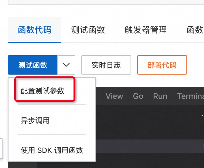 - 点击“代码”页签中,“测试函数”旁边的下拉按钮,并点击“配置测试参数”。