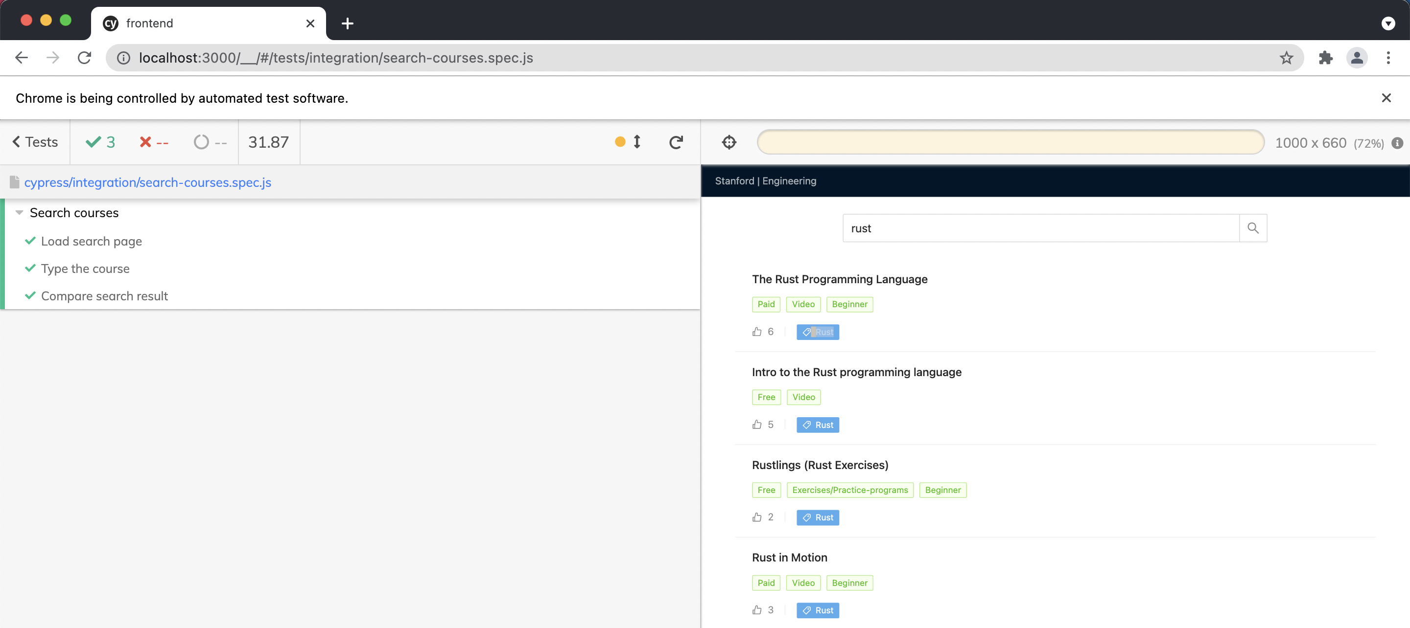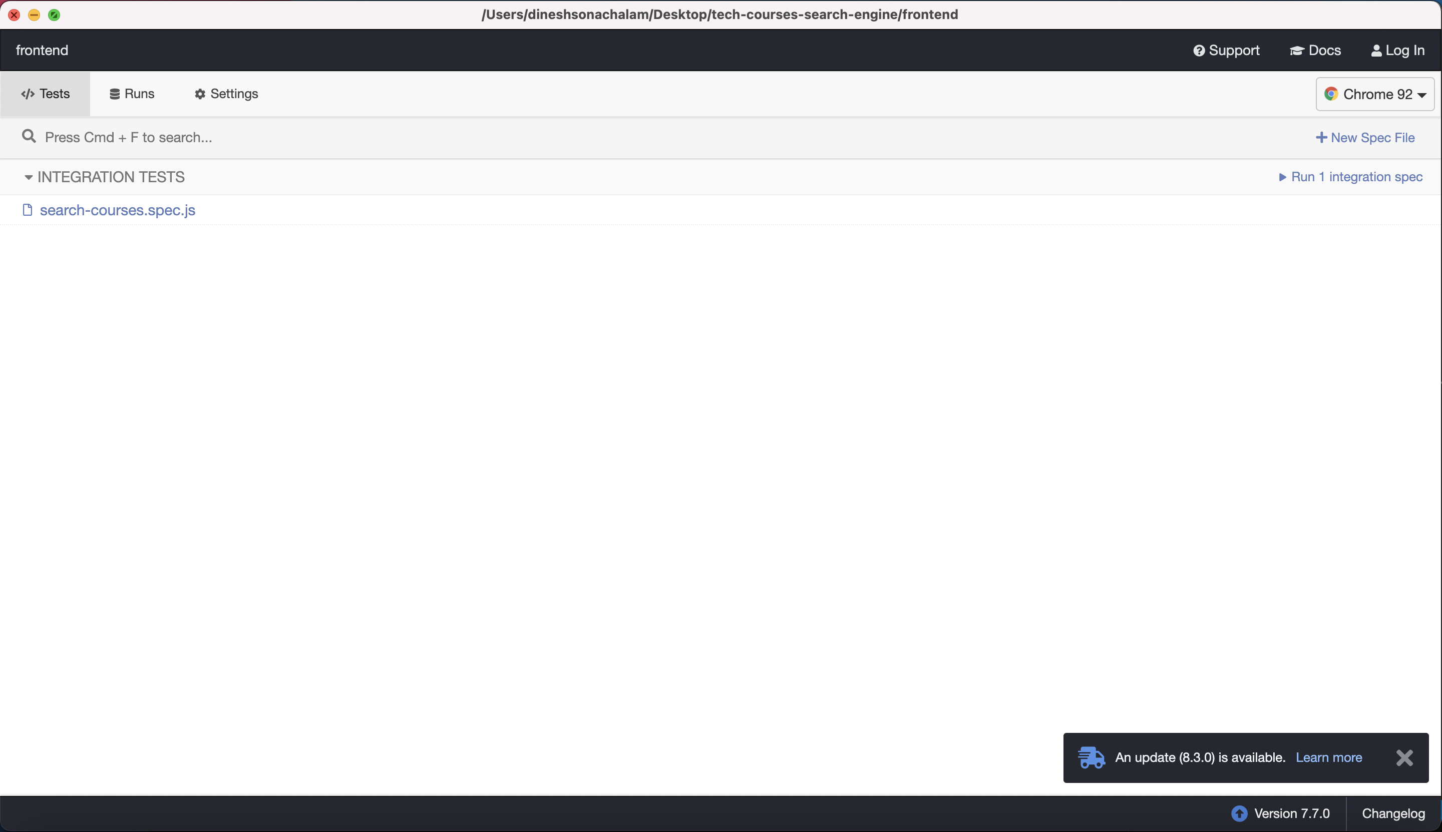 The cypress integration tests for our application is available at frontend/cypress/integration/search-courses.spec.js filepath.