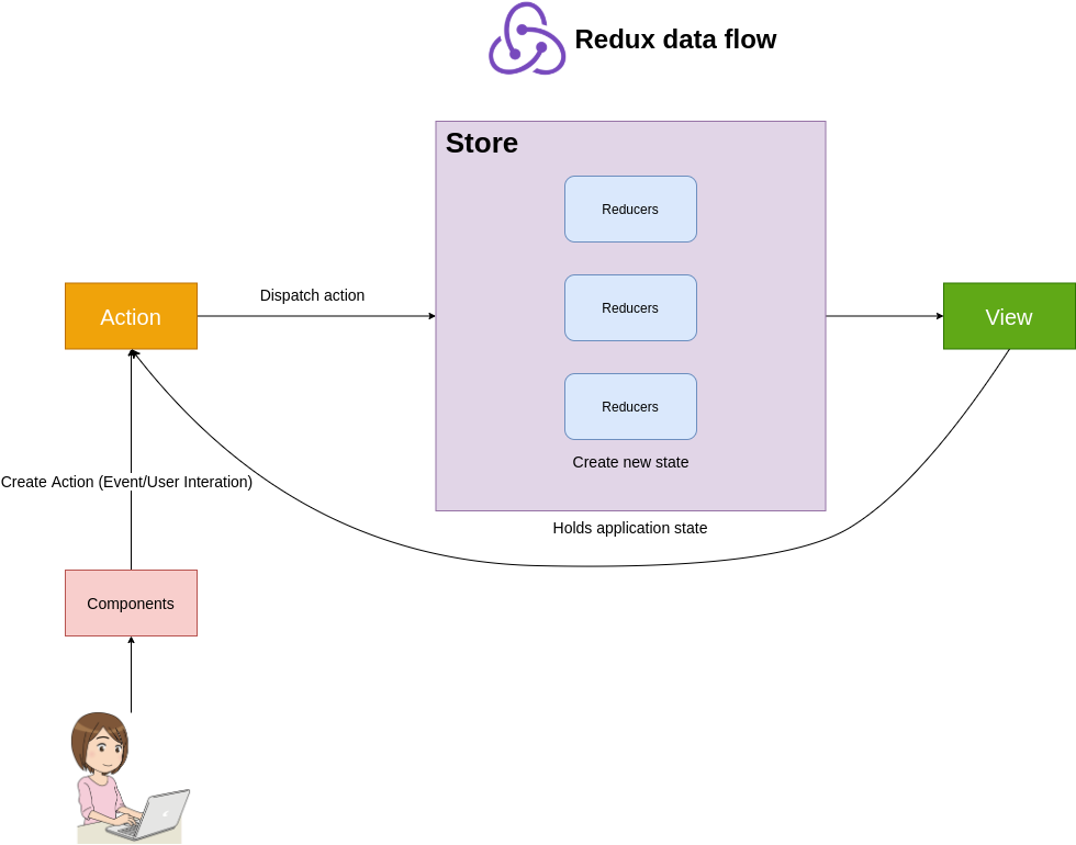 - Action -> Action have a type field that tells what kind of action to perform and all other fields contain information or data.