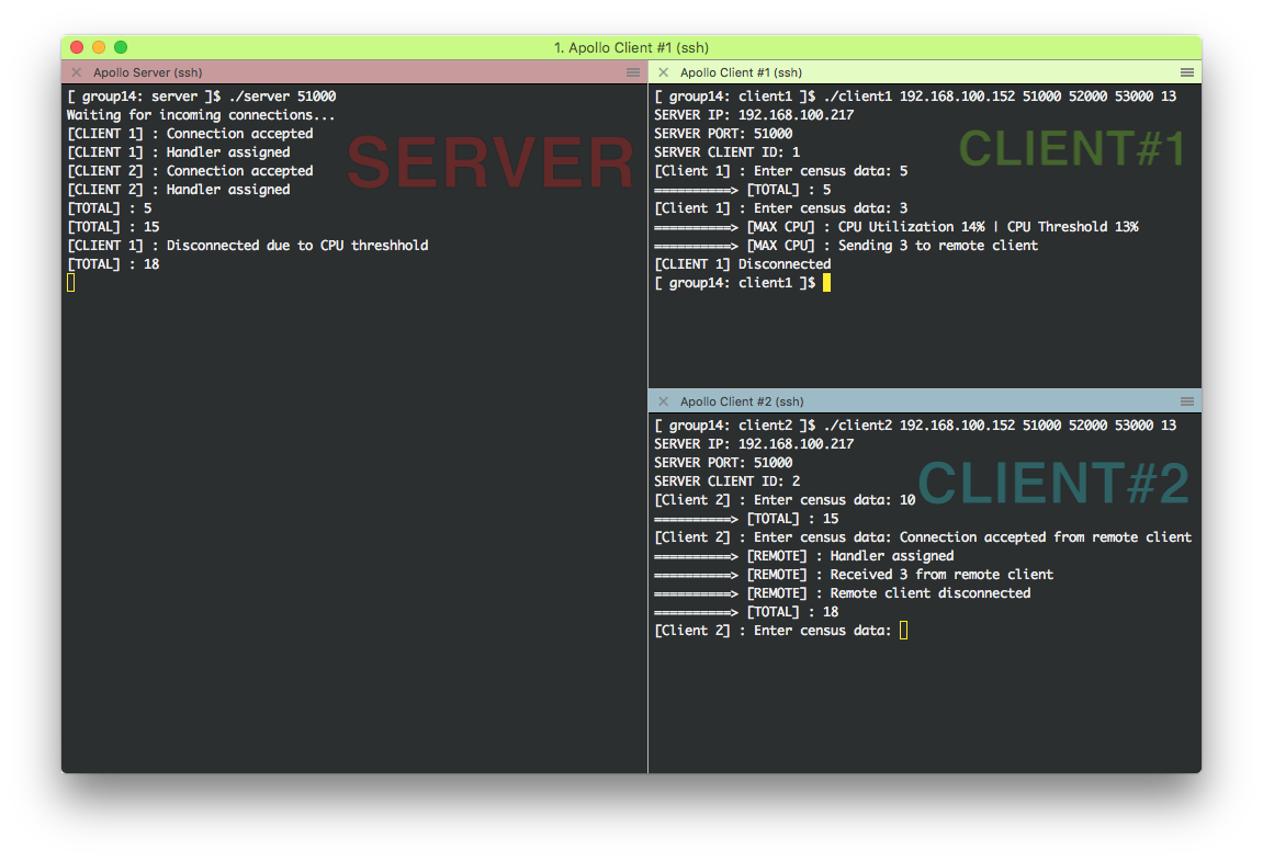 ./client1 <remote client2 IP> <server port> <client1 port> <client2 port> <CPU threshold>