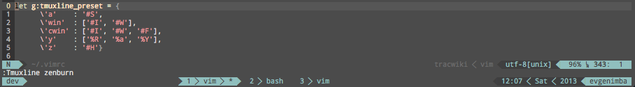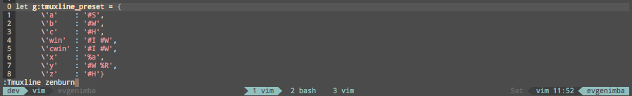 Alternatively, g:tmuxline_theme can be used to fine tune a custom theme: