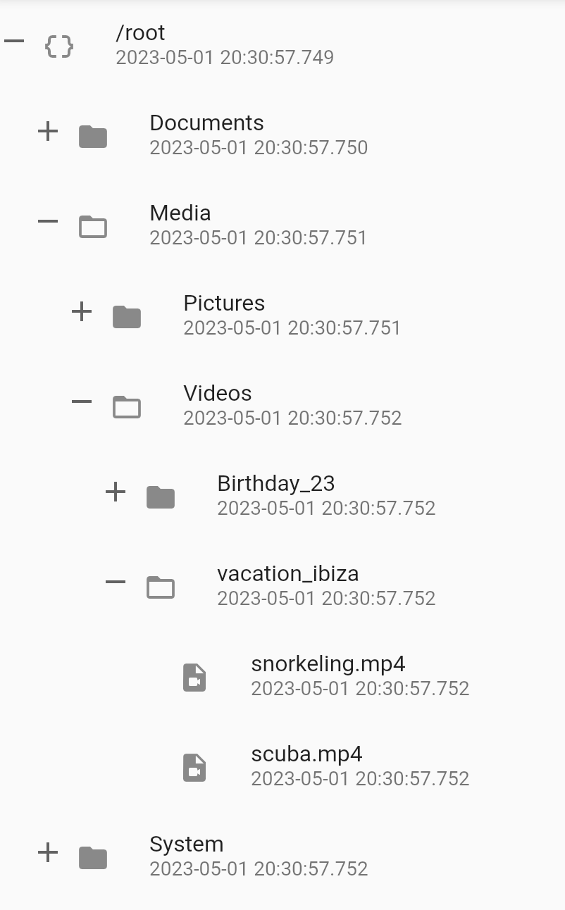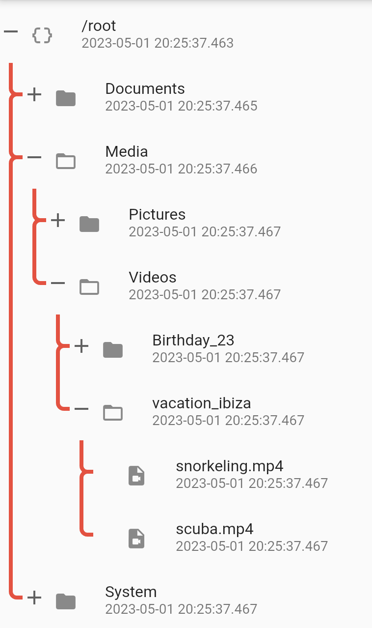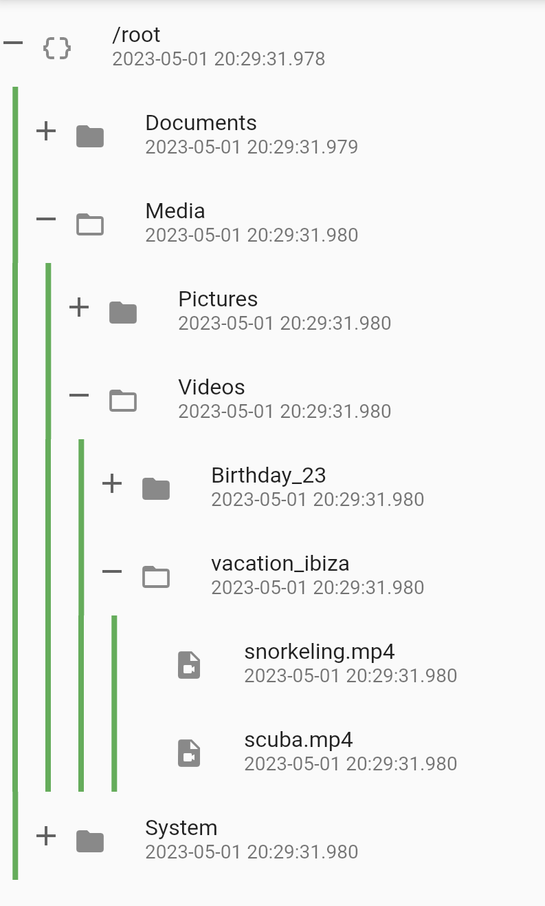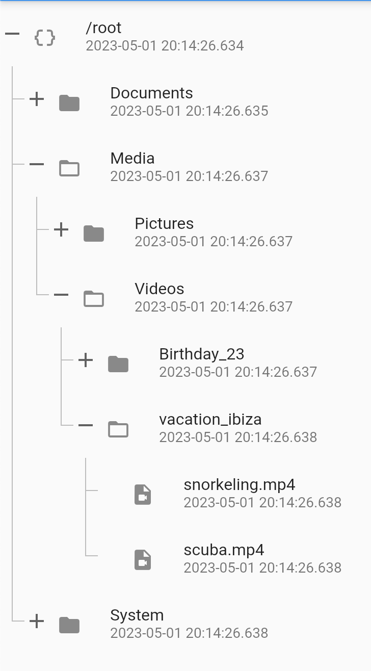| tree | Tree that is used to populate the TreeView. If the tree is updated using any state management tools like setState or Bloc, then the TreeDiffUtil is used to get the diff between the two trees, and apply all the changes from the new tree onto the old tree. |
