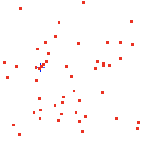 The blue lines show the quads that were generated by the quadtree after inserting the red objects (Entities).