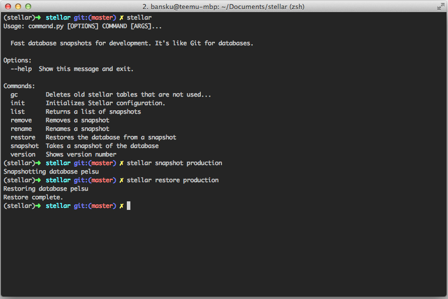 Stellar allows you to quickly restore database when you are e.g. writing database migrations, switching branches or messing with SQL. PostgreSQL and MySQL (partially) are supported.