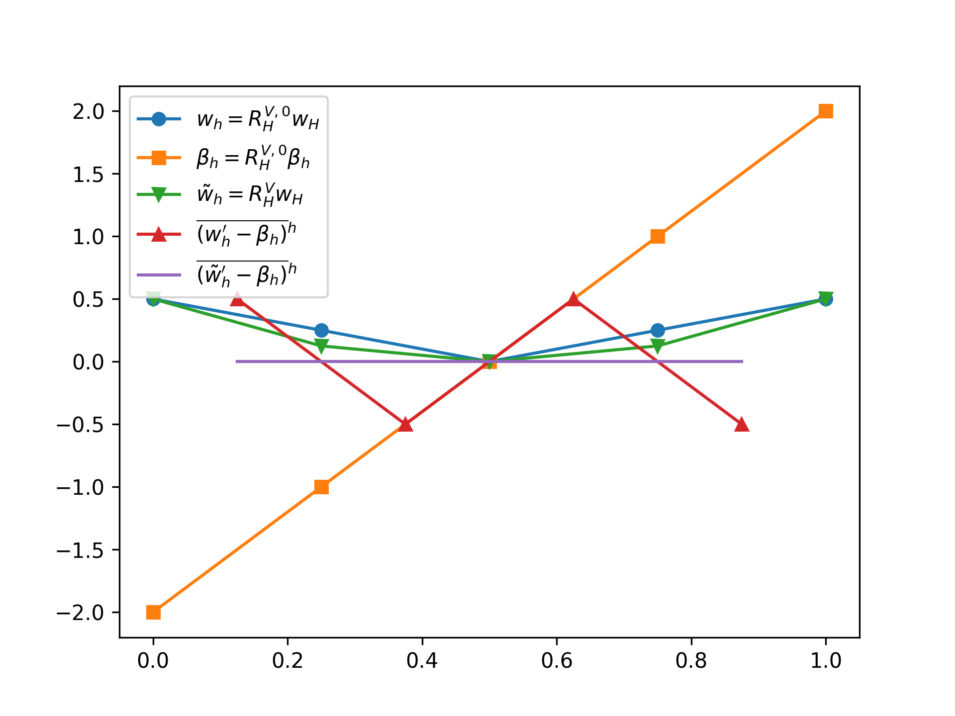 We went through Theorem 4.2 which sets out the requirements for an optimal, parameter-robust, two-grid preconditioner. The idea is to find a splitting of the space Qh such that the prolongation of a coarse grid kernel function can be modified to live in the fine grid kernel by modifying only those dofs that live on "interior" fine grid entities. This way the problems decouple and can be solved efficiently. This is shown using an example of the Timoshenko beam in Figure 4.2. This figure is slightly misleading because it looks like both variables have the same scale. I wrote some code to show what is going (with the right scaling).