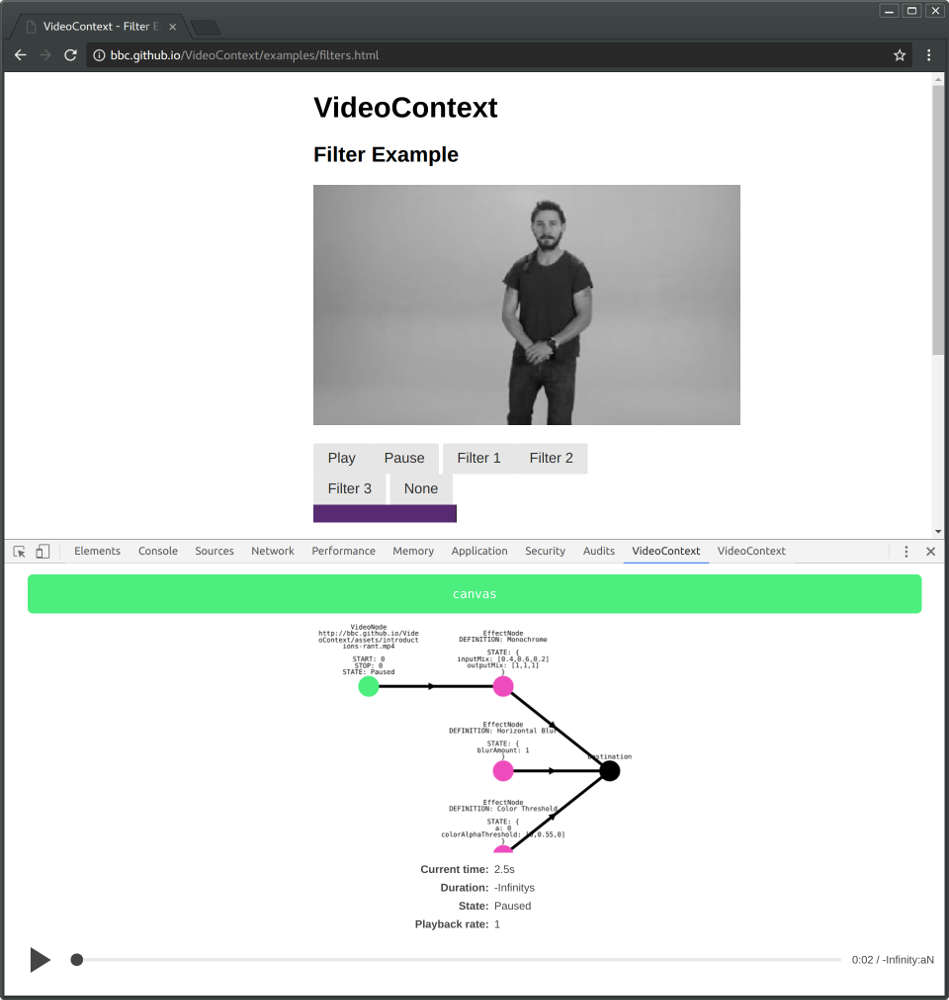 </html>If you need to debug video context graphs or get a better insight into what is happening under the hood, there's a new browser extension for chrome, videocontext-devtools