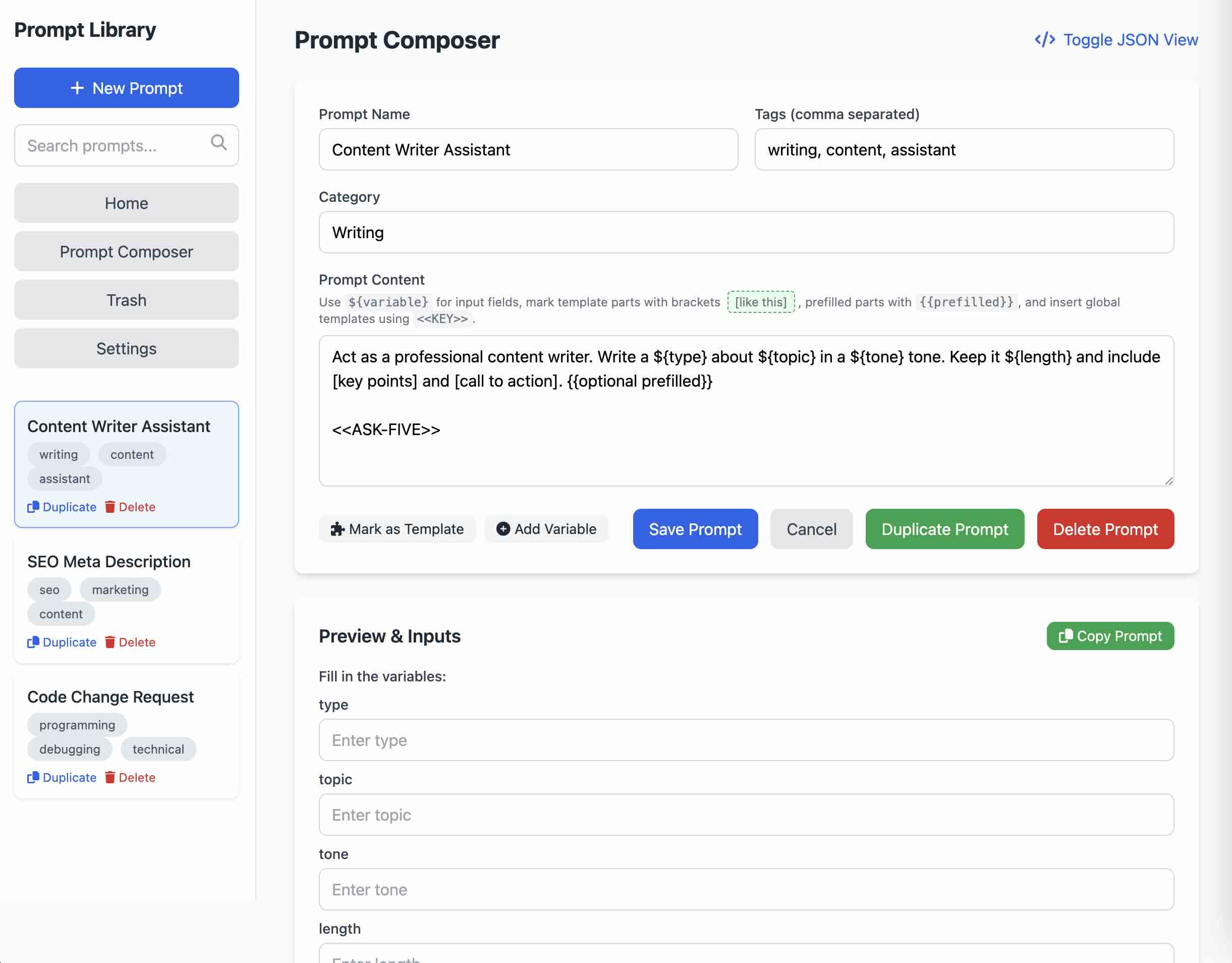 Preview & Copy: Whenever you load up a prompt, you'll get a live preview that updates with your chosen variables, templates, etc. Then it's just one click to copy the final text.