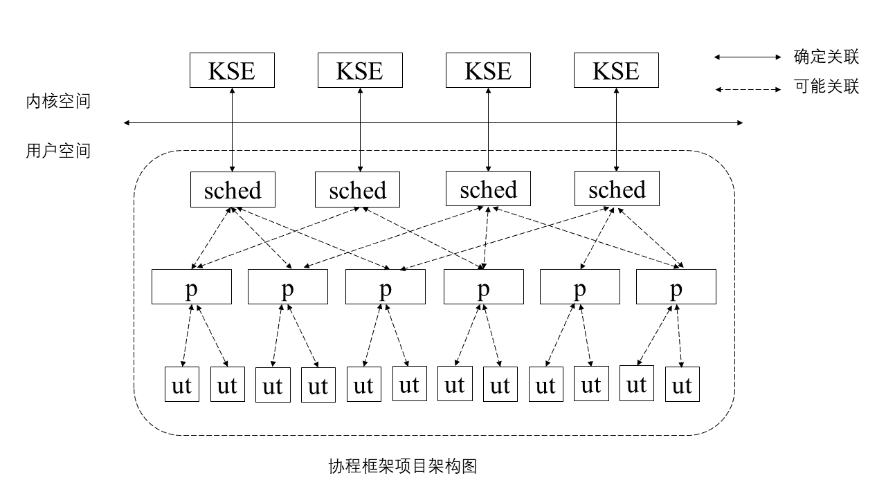 架构涉及三个核心组件,图中KSE为内核调度实体,即内核线程。三个组件简要说明如下: