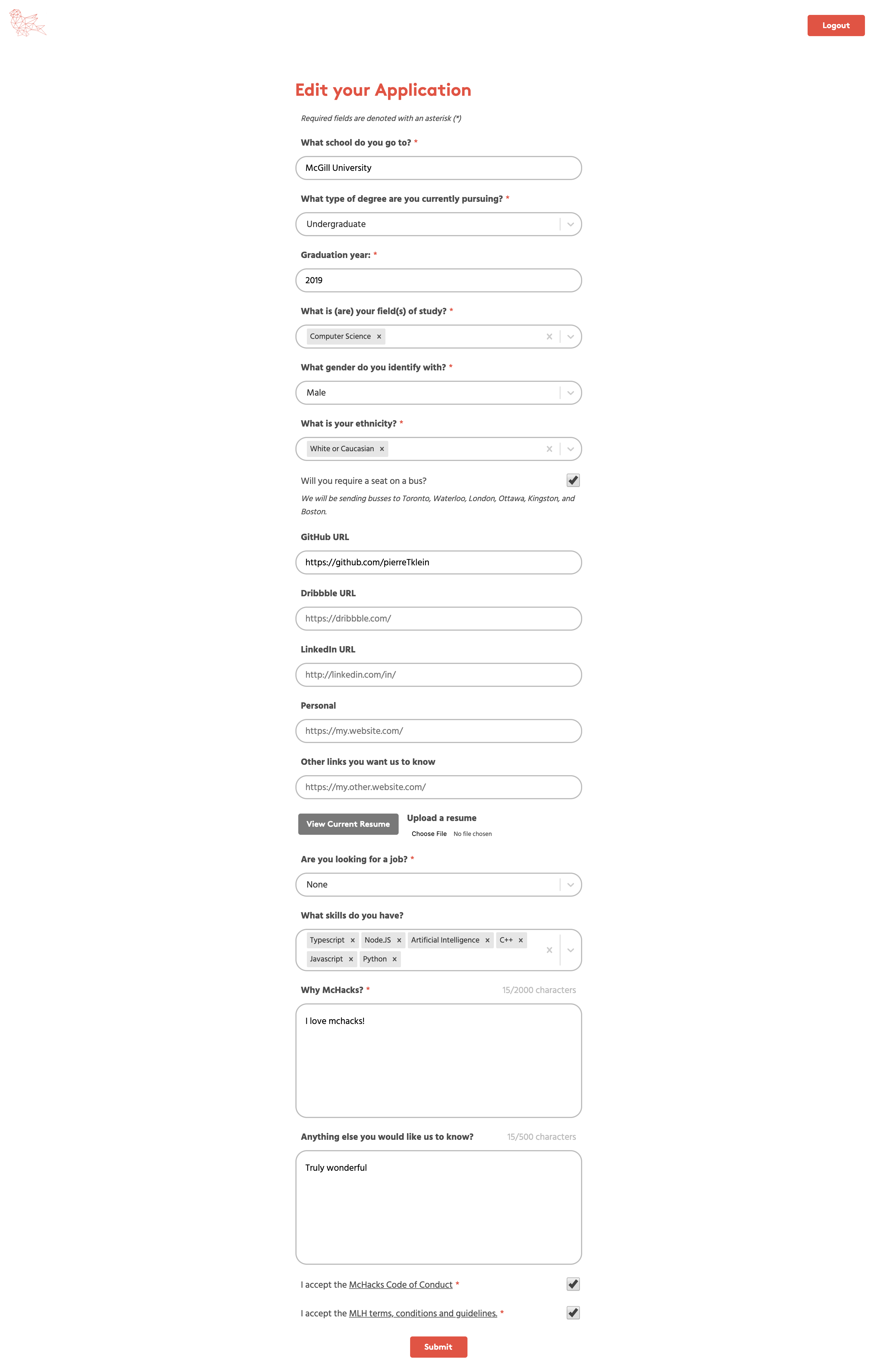 This repository contains the code for the hackathon dashboard of McHacks, Canada's favourite hackathon hosted annually at McGill University. It connects with our API and is hosted at app.mchacks.ca.