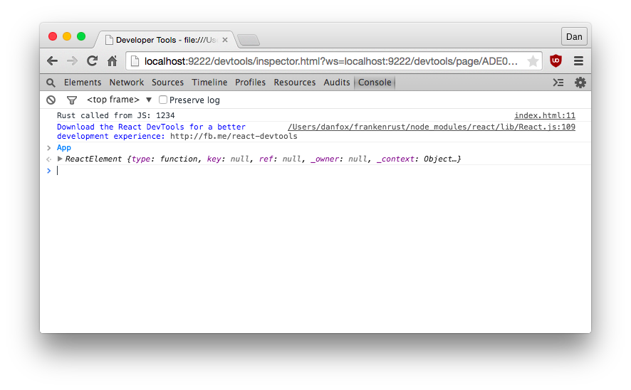 I skim the wiki page on Differences of JavaScript contexts. Strange that React isn't working under nw.js's node context. Nevermind, we'll stick to browser dev. Lightly tweaking an example from from the React homepage, I update index.html to look like this: