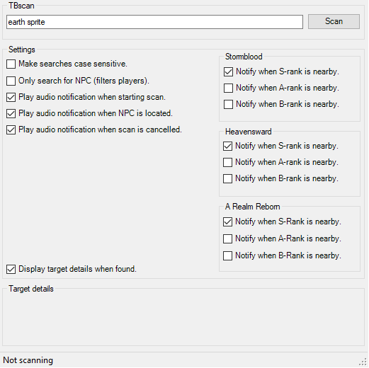 TBscan Is an ACT plugin that scans nearby mobs to find "Hunts" and plays an audio notification when one is nearby. It can also be used to search for a specific target (players or NPC).