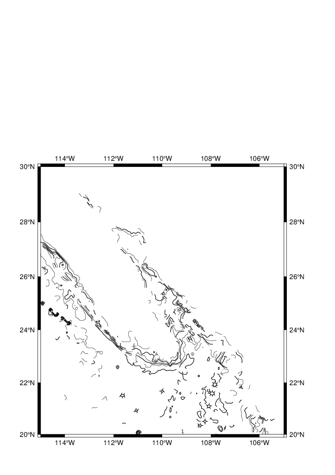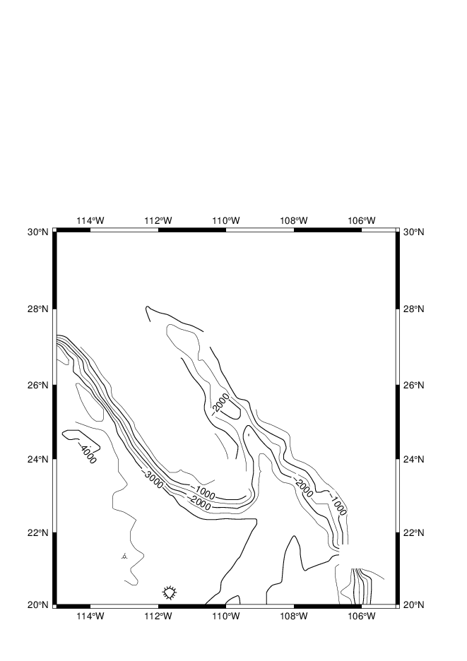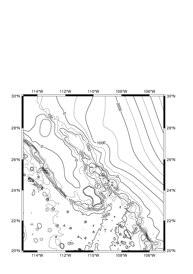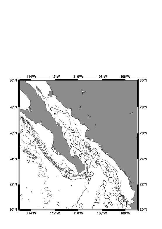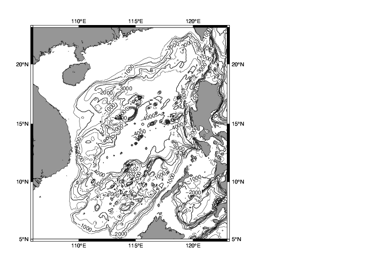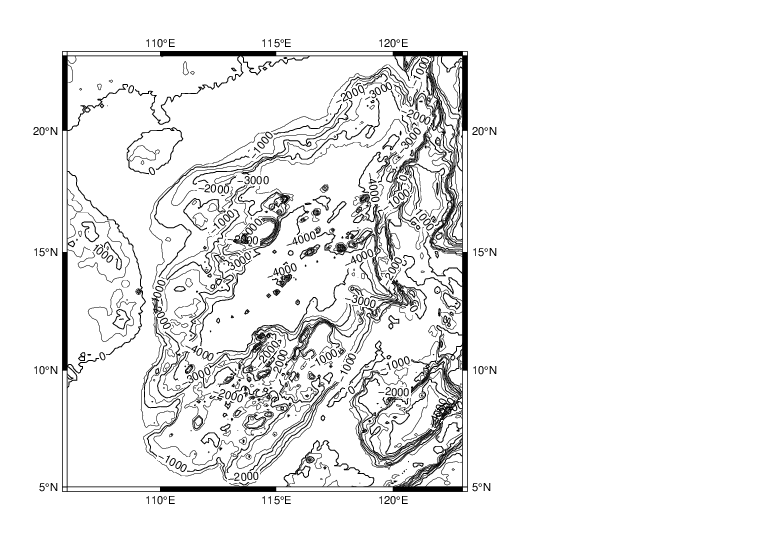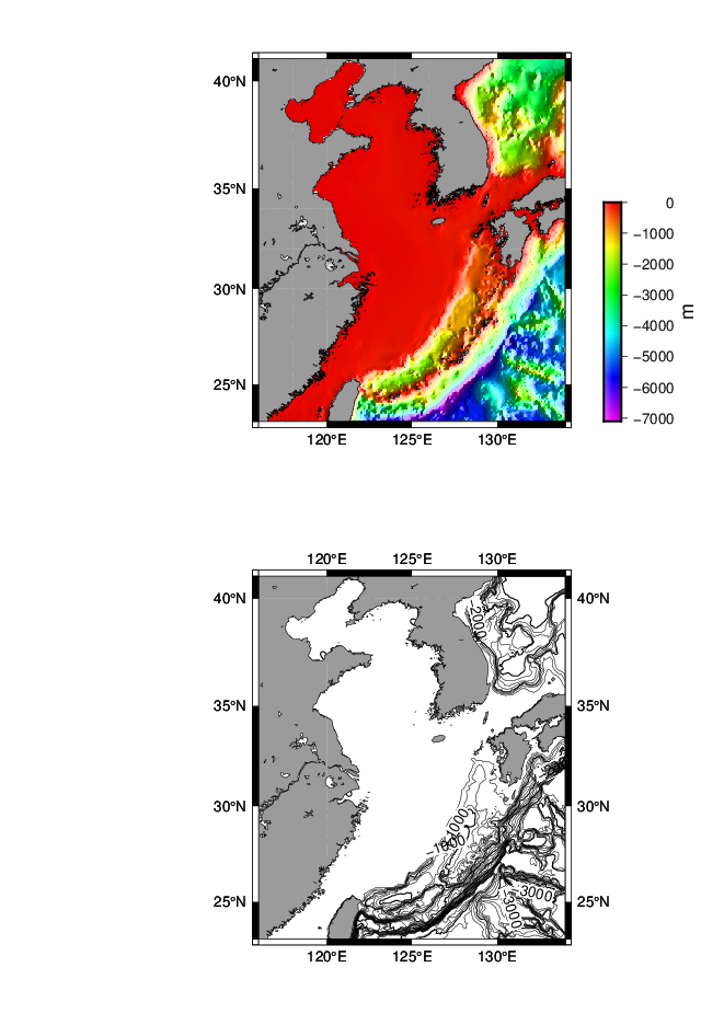 grdcontour W17_ecs.b -R116/134/23/41 -JM3.5i -C250 -A1000+f12 -P -Q50 -B5 -Y-15c -O -K >> W17_test.ps