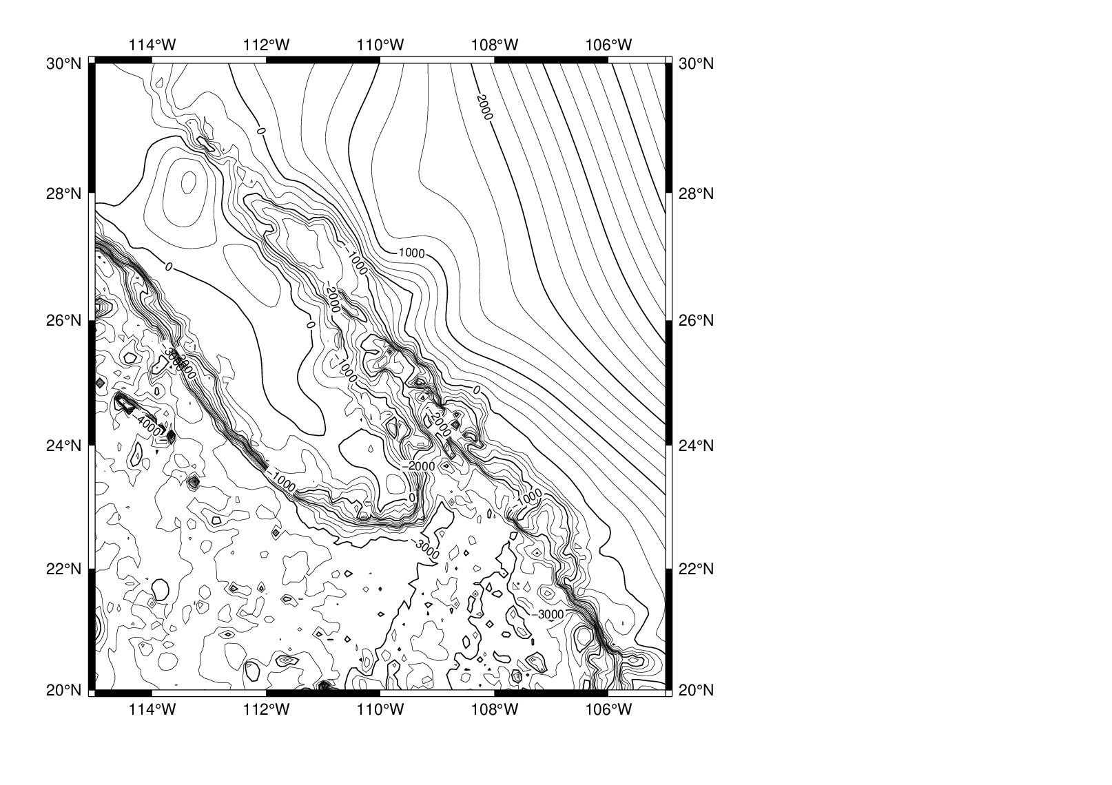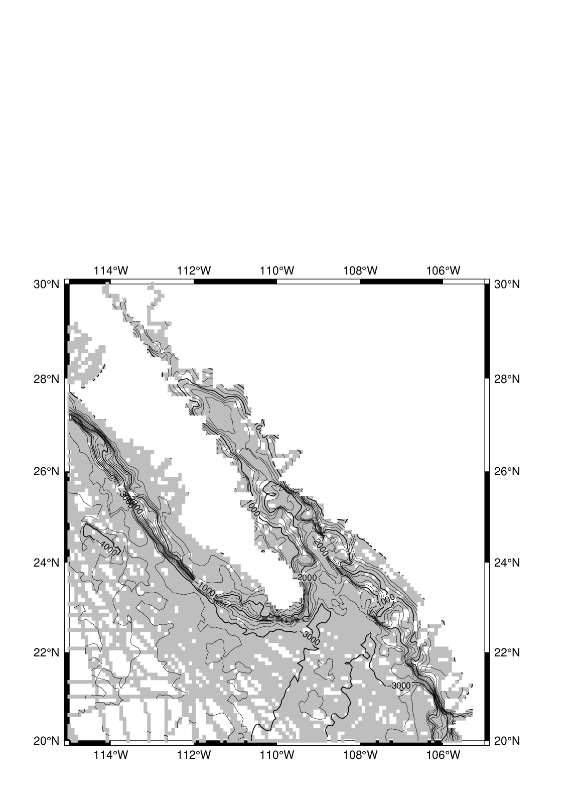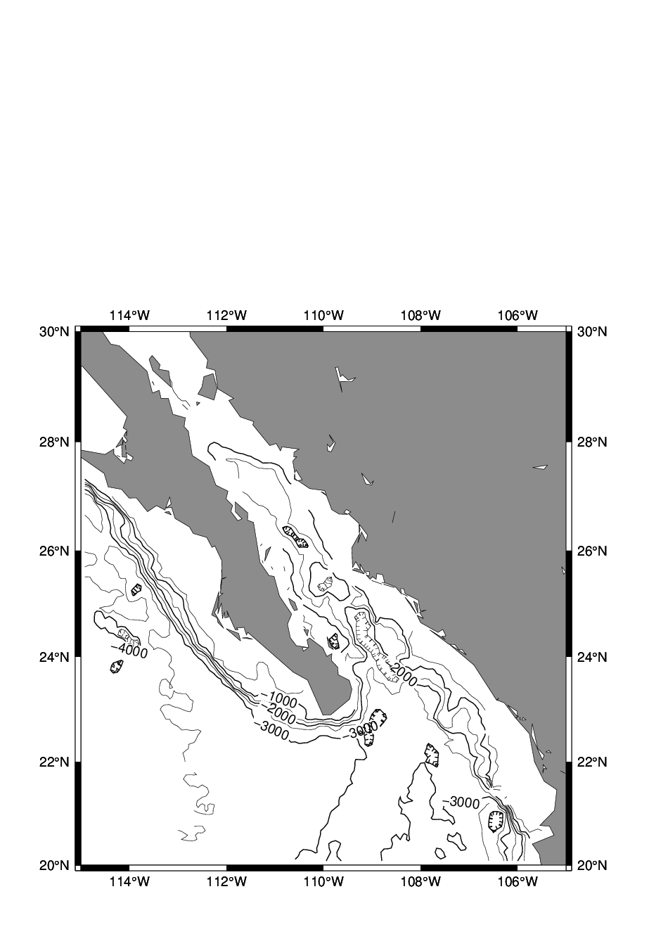 grdcontour W17_ecs.b -R116/134/23/41 -JM3.5i -C250 -A1000+f12 -P -Q50 -B5 -Y-15c -O -K >> W17_test.ps