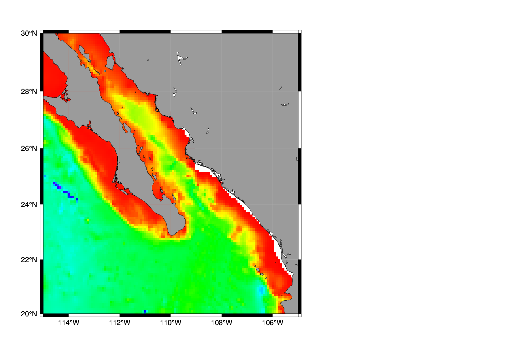 surface ship.b -R245/255/20/30 -I5m -Gship.nc