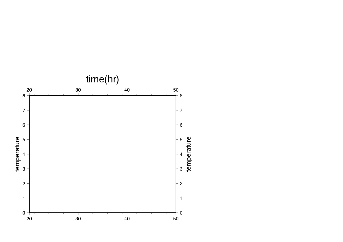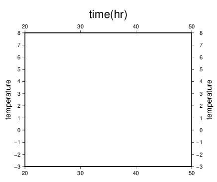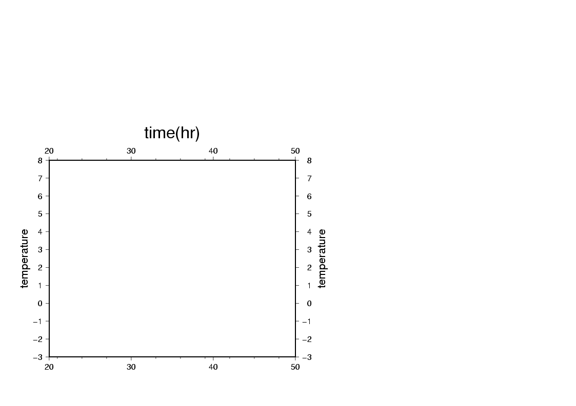 $ psbasemap -R20/50/-3/8 -JX5i/4i -B10:."time(hr)":/1:temperature: -P > plot.ps