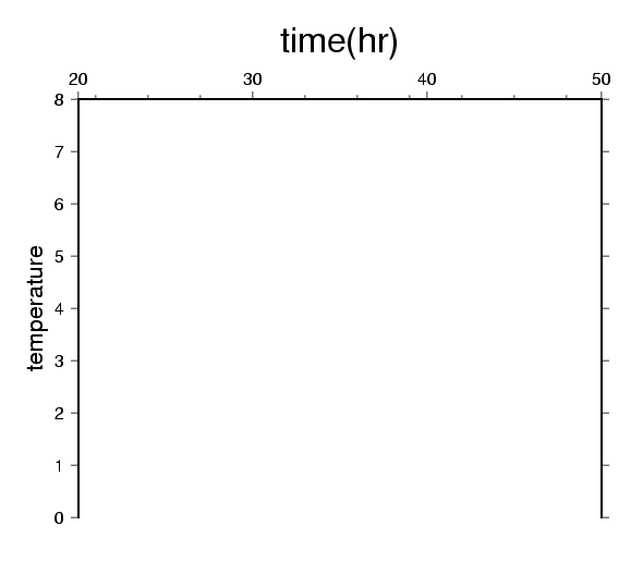 $ psbasemap -R20/50/0/8 -JX5i/4i -Ba10f3:."time(hr)":/1:temperature:WNe -P > plot.ps