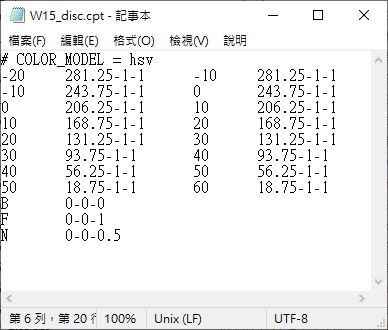 $ makecpt -Crainbow -T-20/60/10 -Z > W15_cont.cpt
