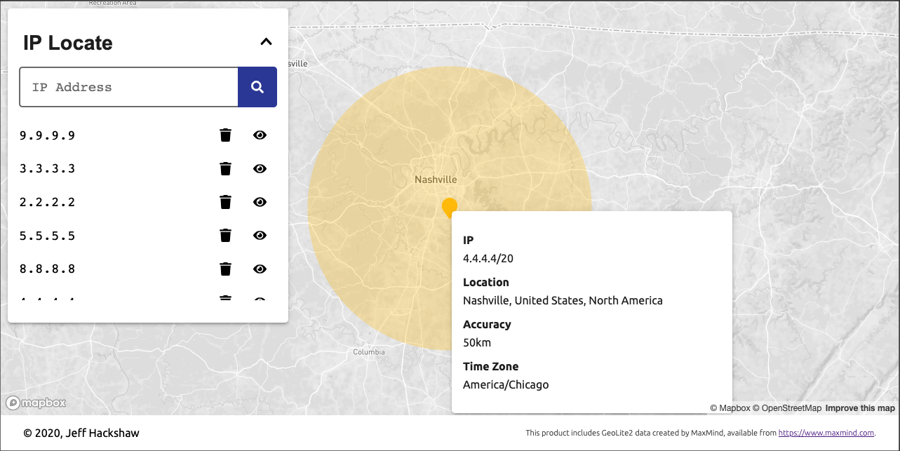 IP Locate is a tool for querying and plotting geographic information for ipv4 and ipv6 addresses via the MaxMind GeoLite2 dataset.