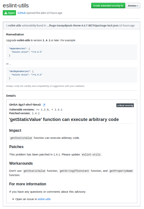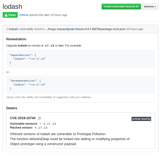 I received these security alerts today:   [package-lock.json](https://github.com/kakawait/hugo-tranquilpeak-theme/blob/master/package-lock.json) needs updating.
