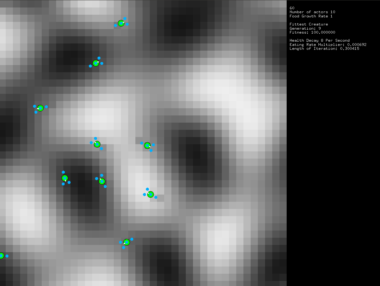 An evolution simulator. There are creatures that eat food and a map that has food. Creatures have genomes encoding their brain(a simple 3 layer Neural Net), which are evolved.