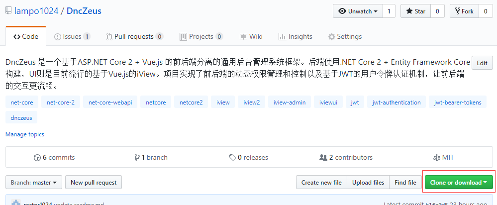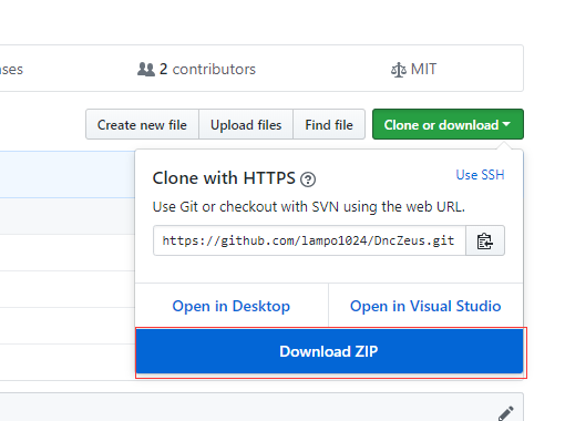 如果你不愿意使用git管理工具下载DncZeus的远程代码,你也可以在github托管地址手动下载,打开地址https://github.com/lampo1024/DncZeus,找到页面中的按钮"Clone or download",如下图示: