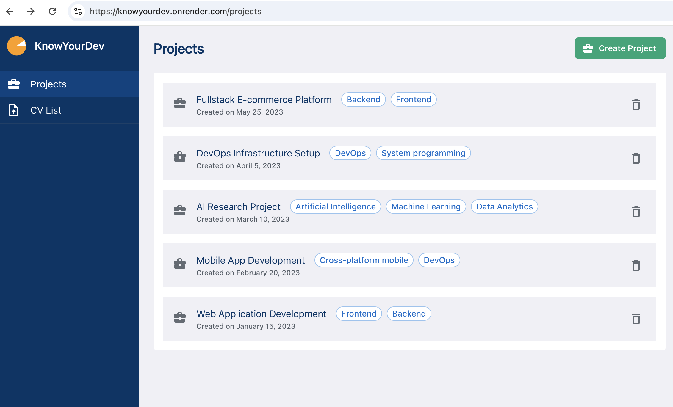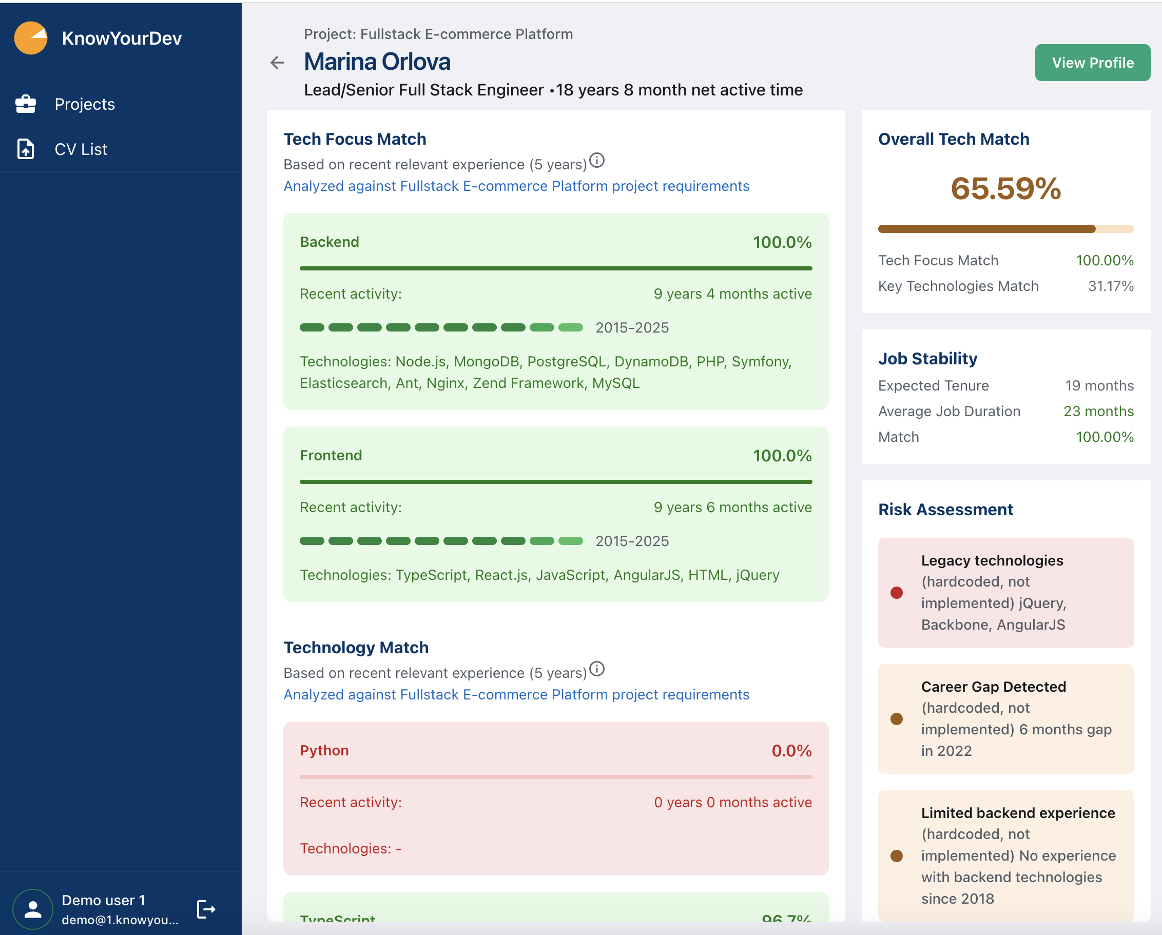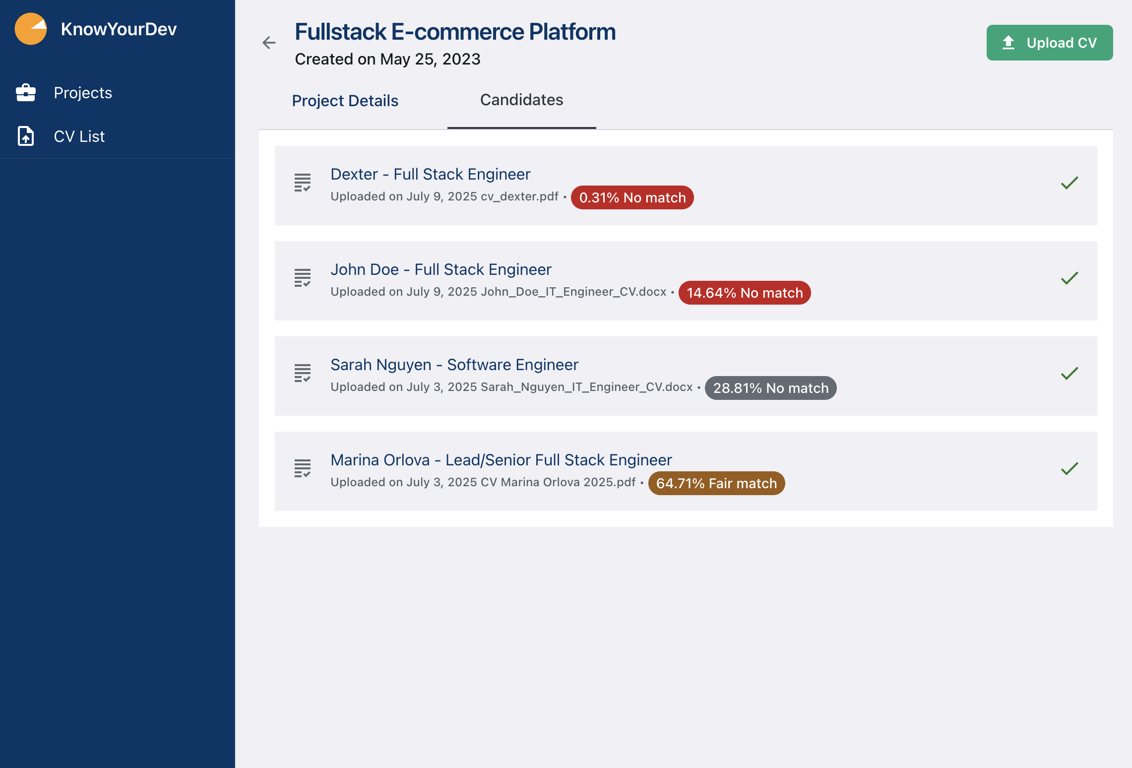 An AI platform for evaluating software engineers. KYD analyzes CVs, scores tech stacks, and highlights strengths and red flags to help employers quickly assess developer suitability.