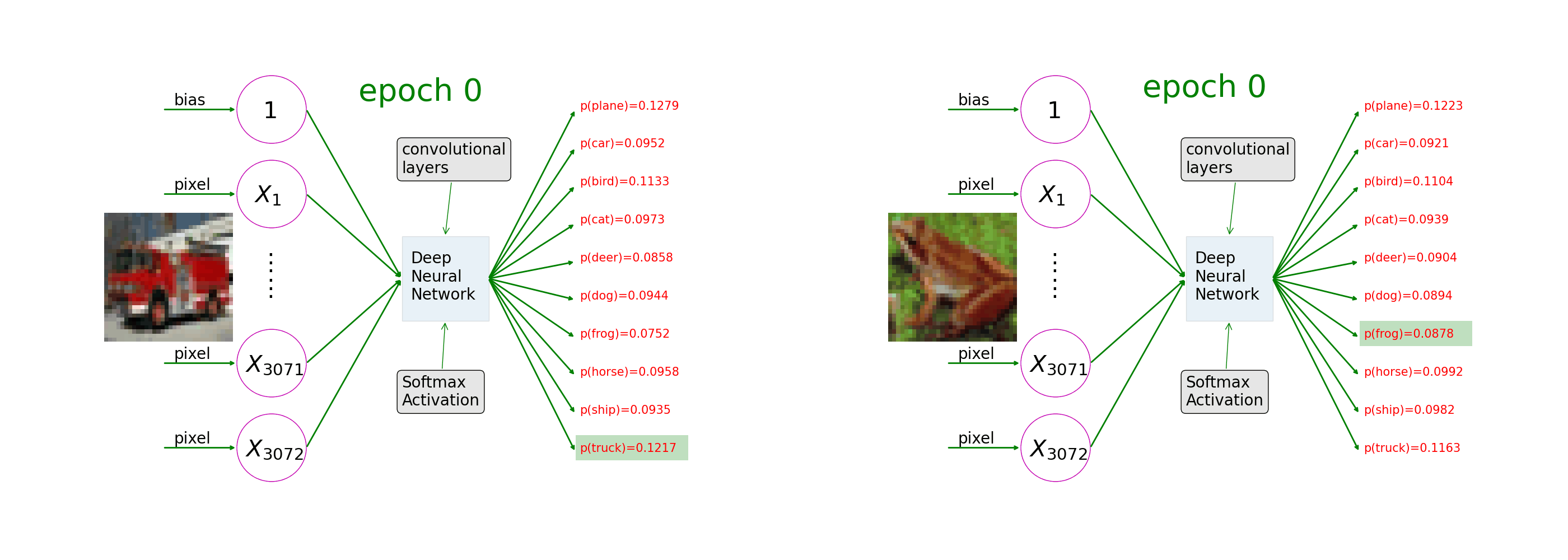 Understand how image augmentation and convolutional layers help neural networks learn from image-label pairs. As the training progresses, the 10th value of the prediction on a picture of a truck goes closer and closer to 1 and the rest to 0 (as in the left of the animation); the 7th value of the prediction on a picture of a frog goes closer and closer to 1 (as in the right of the animation).