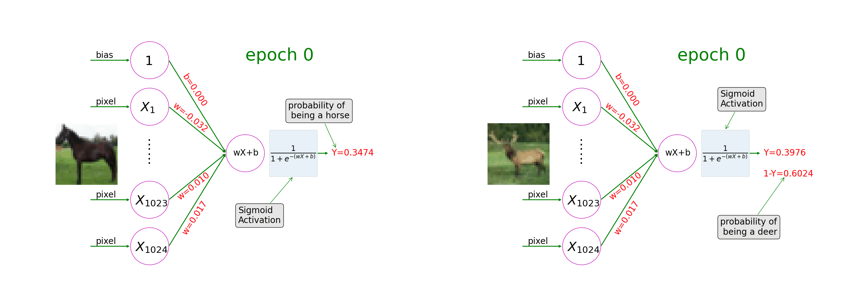 See how a neural network with sigmoid activation learns from image-label pairs. During the course of training, the model weights gradually change and the prediction on a picture of a horse goes closer and closer to 1 (as in the left of the animation) and the prediction on a picture of a deer goes closer and closer to 0 (as in the right of the animation).