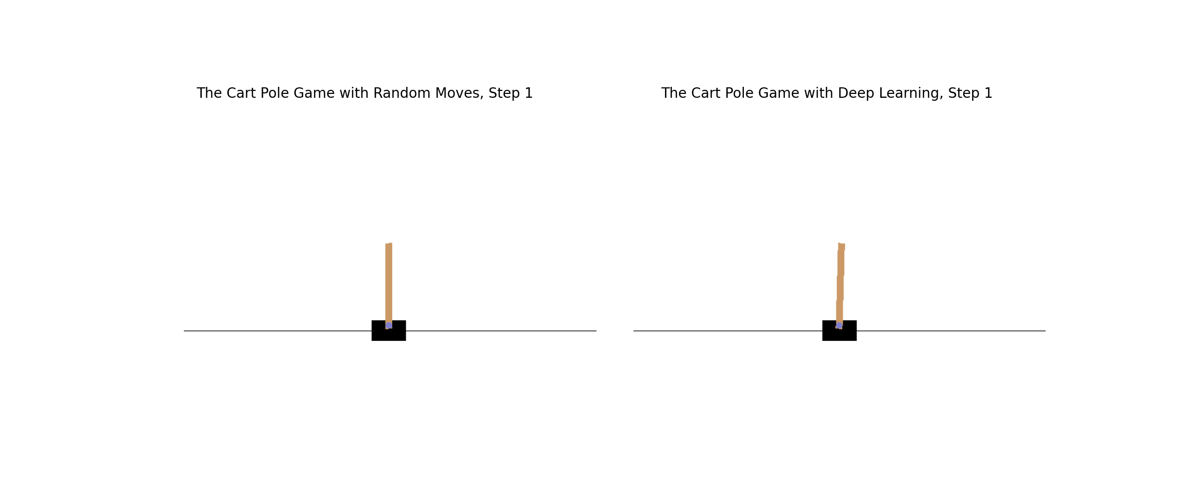 Learn how to creatively apply deep learning to any situation. The Cart Pole game in OpenAI Gym poses a challenge since there is no clear definition of winning and losing. You'll classify the last ten steps as losing and the rest as winning; you'll successfully train the model. The animation shows how the game is played with (right) and without (left) deep learning strategies.