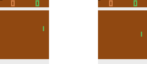 Use policy gradients to train an agent to play Atari Pong. The left side shows what happens if the agent chooses random moves. The right side shows when the agent is trained with policy gradients. The trained agent plays perfectly, earning a score of 21-0.