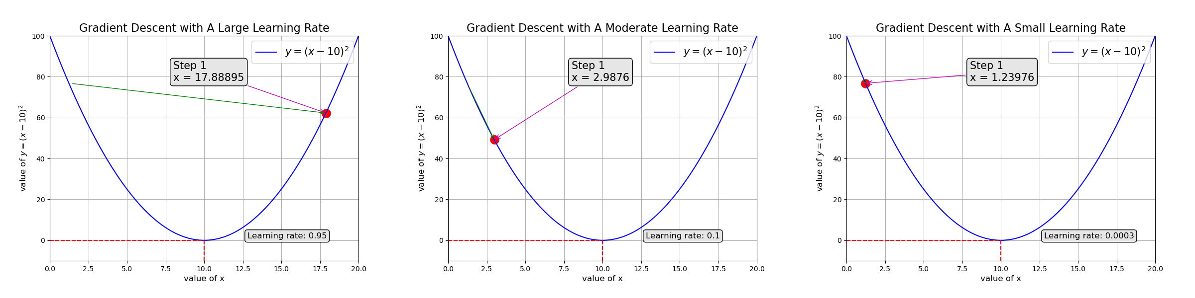 Gradient descent guides the model to adjust parameters so they converge. The learning rate controls how fast to adjust: too fast, the parameters never converge (left of the animation below); too slow, it takes too long to train the model (right side)