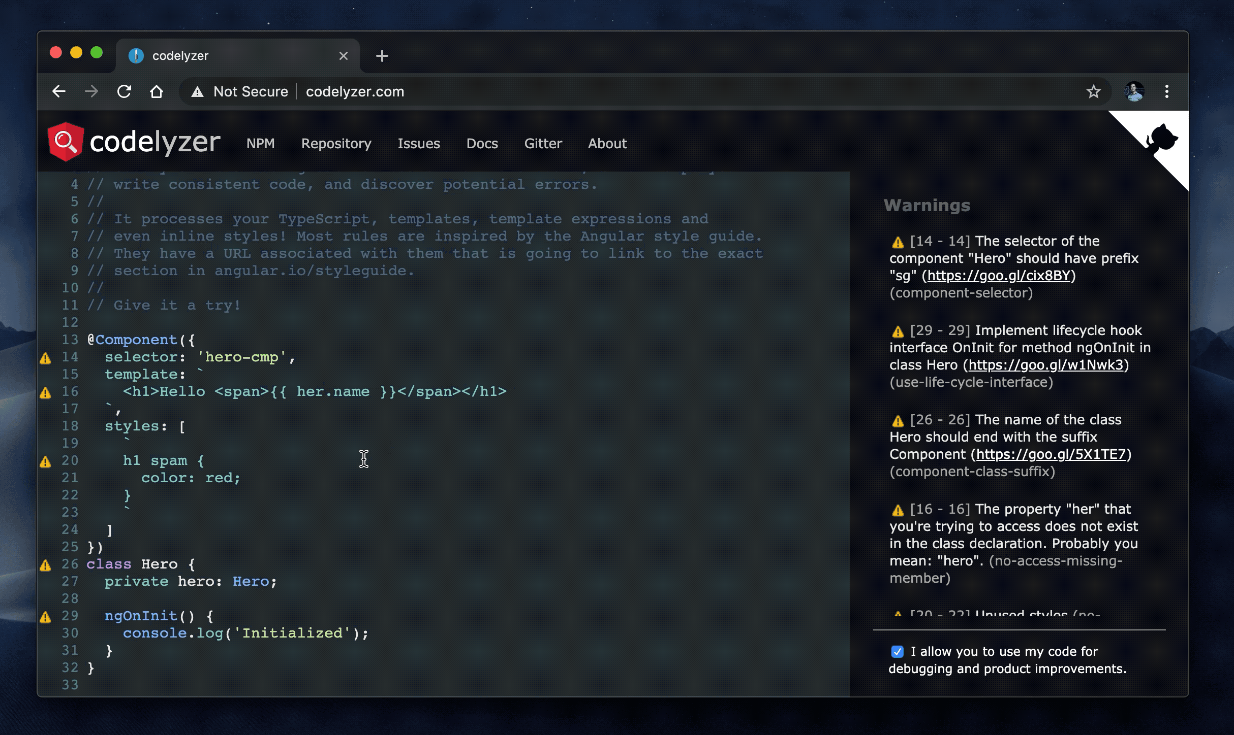 Another project which has out of the box integration with codelyzer is angular-seed. In order to run the linter you should: