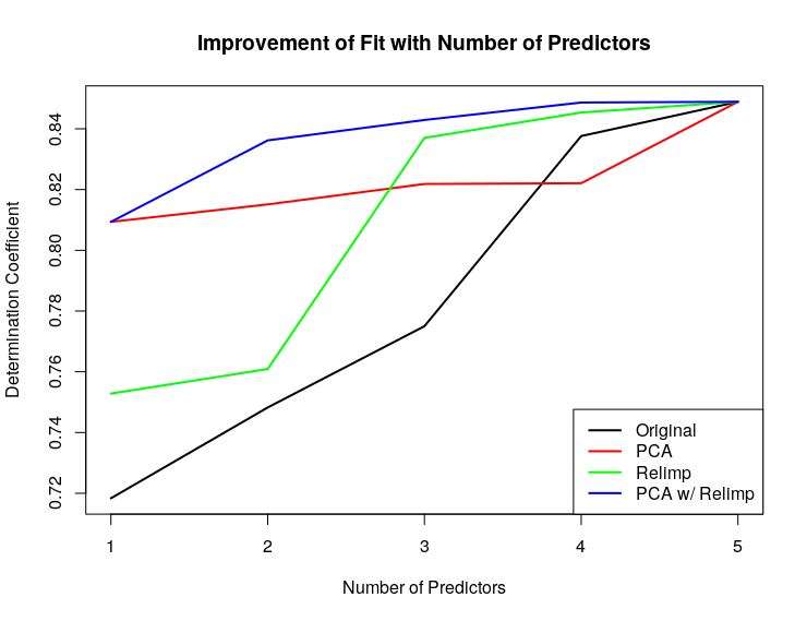 An alternative method, optimized for a regression against Y, is to use both PCA and a relative importance measure. This package applies PCA to a given data frame of X values, and then calculates the relative importance of each PCA factor against Y. It outputs ordered factors that are optimized for model fit. By performing dimensionality reduction with this method, an individual can achieve a the same r-squraed value as performing just PCA, but with fewer predictors.