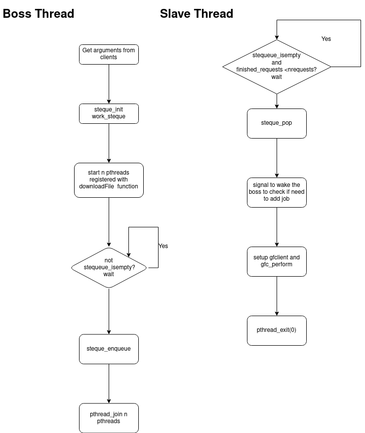 is used to keep the info for user input requests. slave threads are used to pop info out of steque_t and call gfc_perform in gflib to receive file. Sepereate condition variable and opposite predicate are used for boss thread and slave thread so that only one thread would have access to the global steque_t to avoid error. (enqueue and pop at the same time would lead to incorrect result due to they are not atomic operation for linked list).