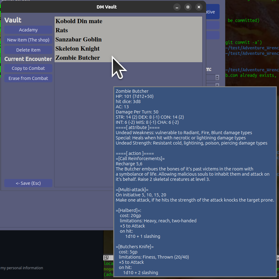 The vault is a repository of all unique things that can be copied into the current game when needed. Think varients of a monster, trap, npc, or boss. Or even pre-generated lists of information like lore, background, or geography.