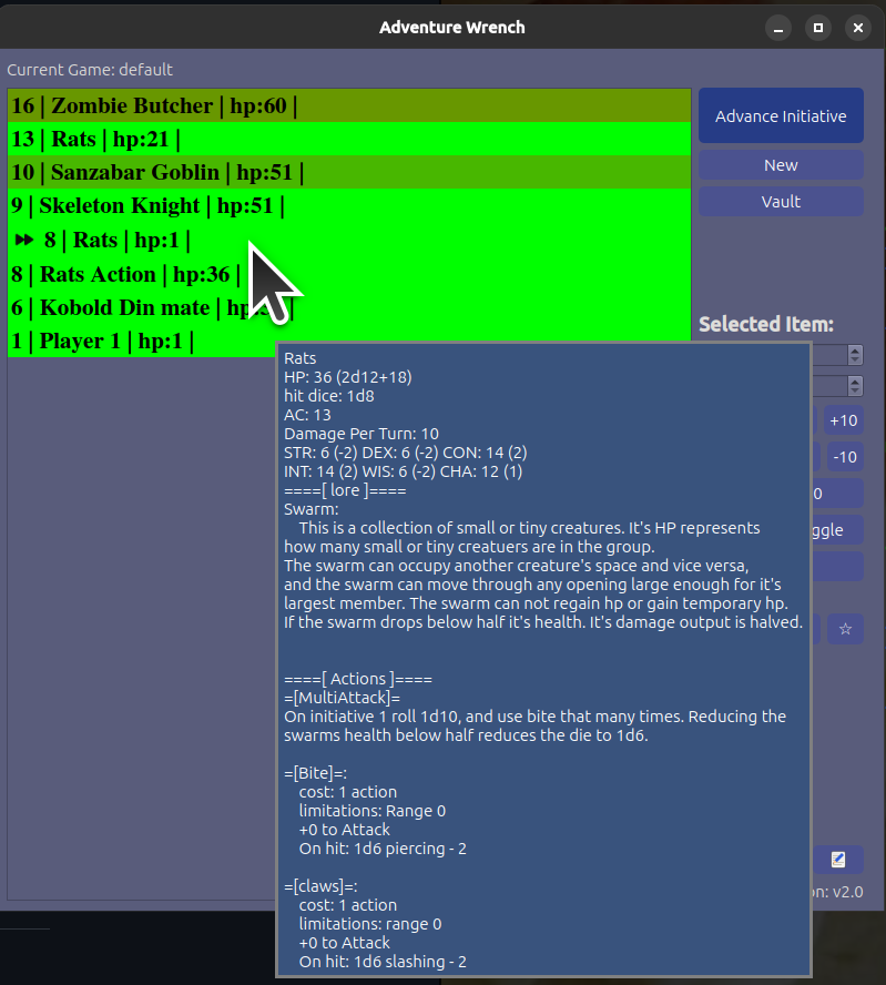 The Main window for this program is the game tracker. It keeps tabs on important information, notes and marks about the current encounter. It's clean and easy to see what is going on at a glance.