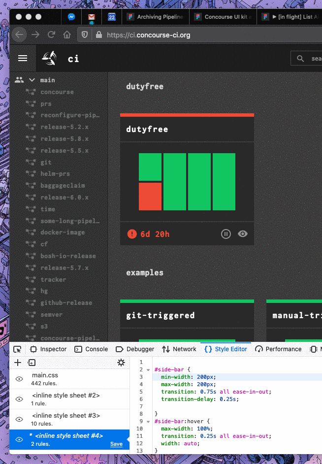 I get the impression that manual intervention is the best solution, but I did think of another more semi-automatic solution. Just posting to get it out of my head and onto the page: Setting some minimum and maximum widths might allow us to automatically expand the sidebar to fit the visible pipeline names on hover, and shrink it down to a less obtrusive list while the user is interacting with the rest of the dashboard: This was obviously hacked together really quickly, so it's not the smartest CSS. I've set some really arbitrary and not totally beautiful widths here just for the sake of explaining, and the .gif doesn't show how smooth it can be in the actual browser, but basically the sidebar expands and contracts, adjusting its maximum width to the longest pipeline name in view. It would require a lot more careful thought and testing to get the timing and interaction right. Just food for thought! |