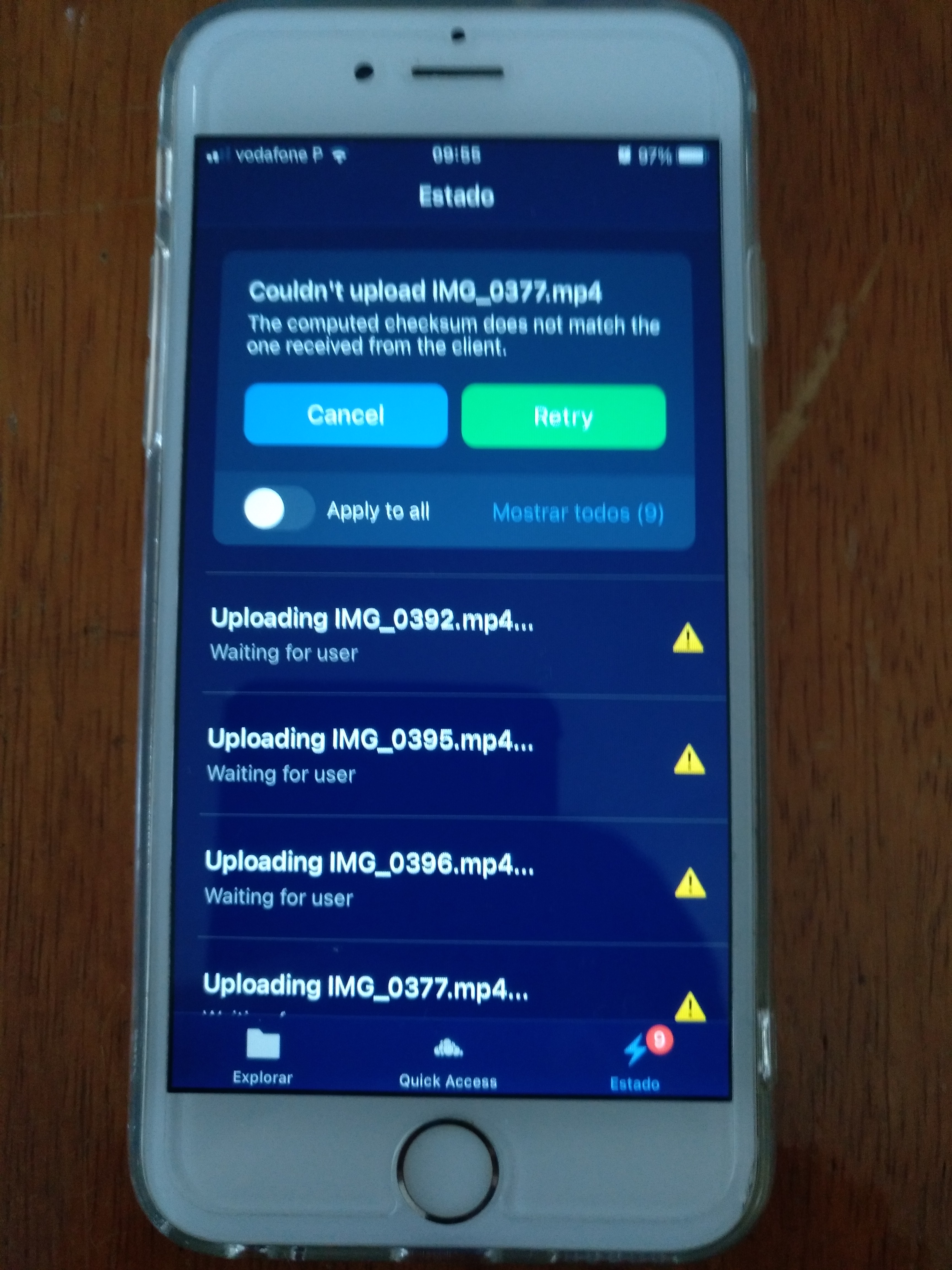 The upload of big files (>200mb) return a error: Couldn't upload IMG_0377.mp4 The computed checksum does not match the one received from the client. iPhone S iOS 14.4 Owncloud version 11.5.2 build 188 Owncloud server 11.6.0