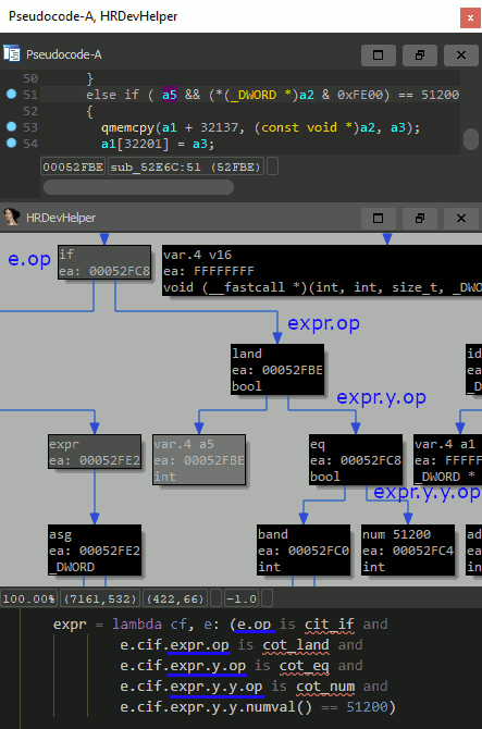 The query illustrated by the animation below is an example for how a vulnerability that affected WhatsApp for Android (CVE-2019-3568, libwhatsapp.so) can be located using HexRays Toolbox. This is done by formulating a desired code pattern that is to be located using an IDAPython lambda function. Find the example script here.