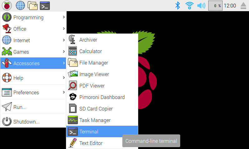 We've created an easy installation script that will install all pre-requisites and get your Explorer HAT/pHAT up and running with minimal efforts. To run it, fire up Terminal which you'll find in Menu -> Accessories -> Terminal on your Raspberry Pi desktop, as illustrated below: