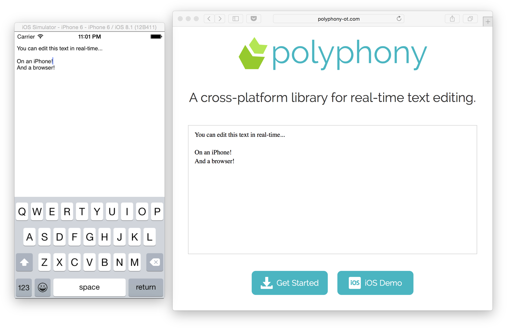 A Polyphony demo running on iOS that performs real-time text editing with http://polyphony-ot.com. It shows how to build a completely native real-time editor without using any WebViews.