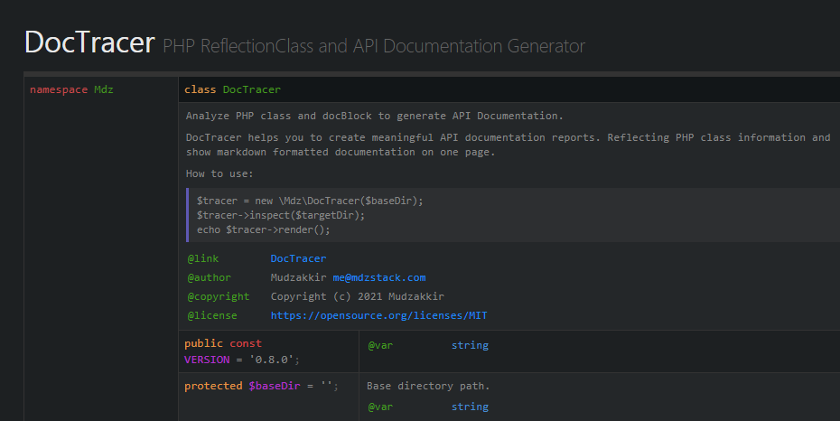 $tracer = new \Mdz\DocTracer($baseDirectory = './');Inspect all PHP codes inside target directory (relative to the $baseDir).