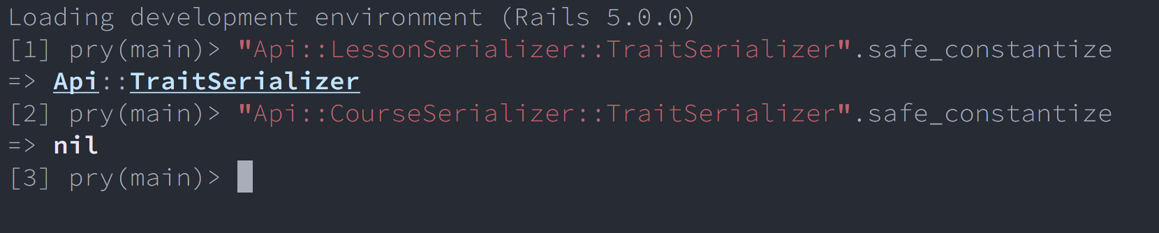 .safe_constantizeon"Api::CourseSerializer::TraitSerializer"returnsnil.Here's an example from the Rails console: