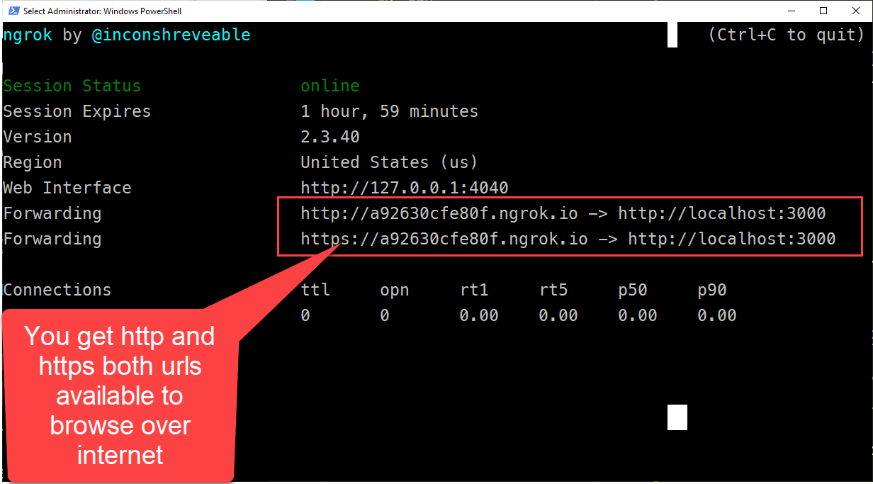We will expose local server over internet by getting brand new internet URL. Open powershell run below script to expose localhost:3000 to public internet.