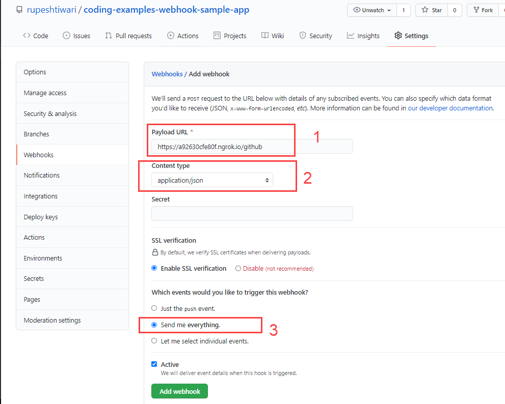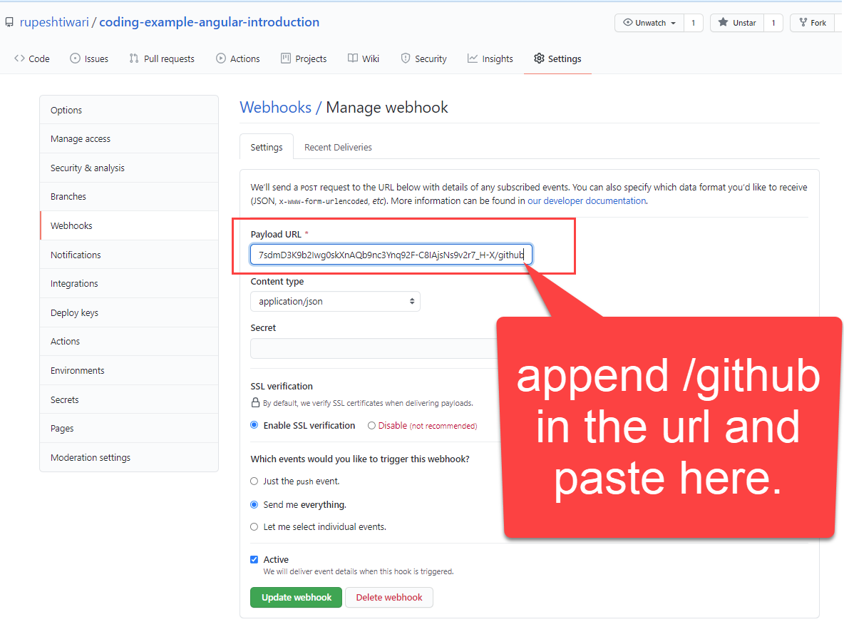 Now in your github you can go and add the web hook URL that you generated just now. Make sure to append /github on your URL.