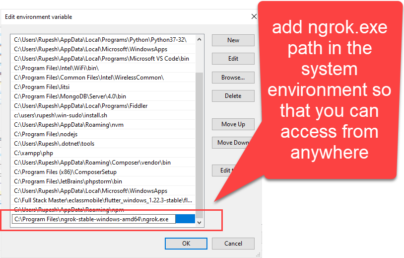 Add ngrok.exe path in the system environment so that you can access from anywhere.