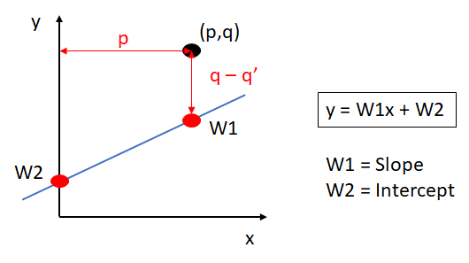 A line with slope w1 and y-intercept w2 would have equation . The goal is to move the line closer to the point (p,q). A point on the line with the same y-coordinate as might be given by (p,q'). The distance between (p,q) and (p,q') is given by (q-q')