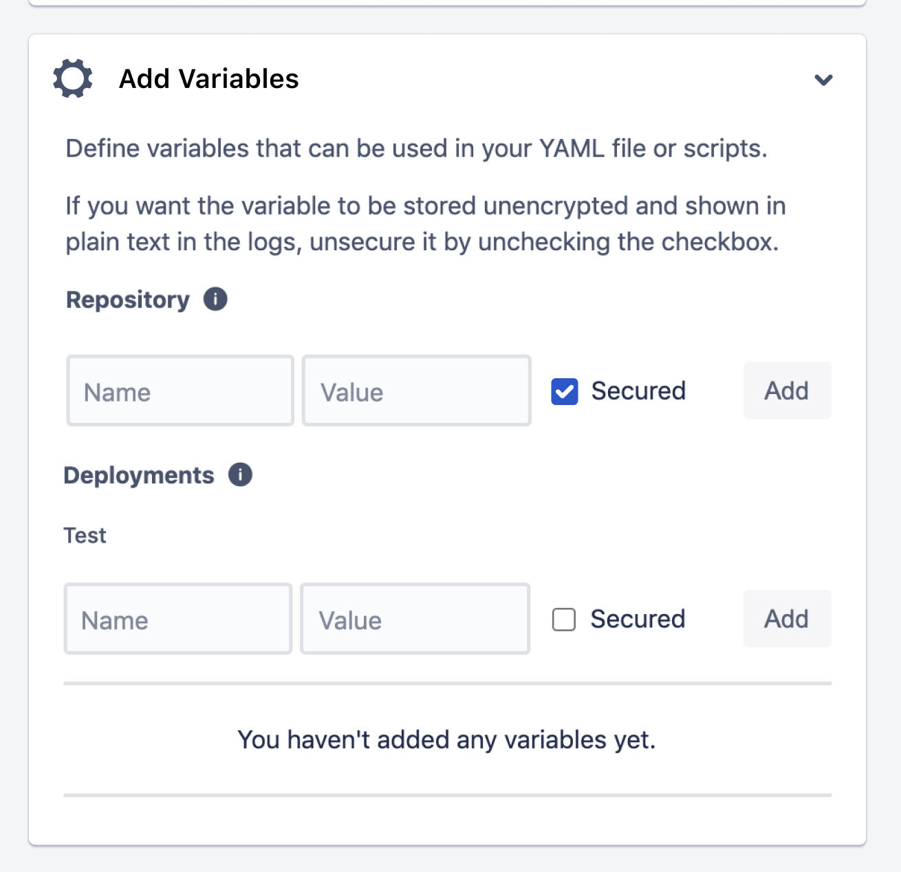 You may need to add more variables in the case where you use a 3rd party modules that require composer authentication. In the most cases you will have these keys at the auth.json file in your Magento 2 root folder. After you add a custom variables you will need to make changes to a pipeline YML File.